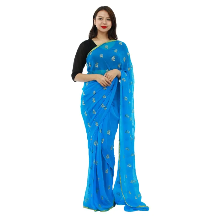 Sky Blue Chiffon Floral Embroidered Golden Border Design Saree For Women