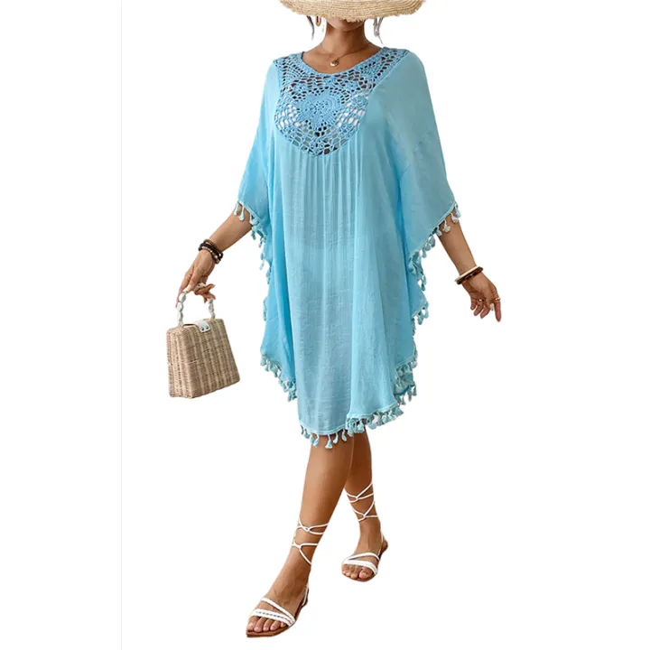 Tassel%20Swimsuit%20Cover%20Up%20Dress%20for%20Women%20Bohemian%20Bathing%20Suit%20Coverups%20Batwing%20Hollow%20Out%20Crochet%20Beach%20Outfits%20-%20Image%201