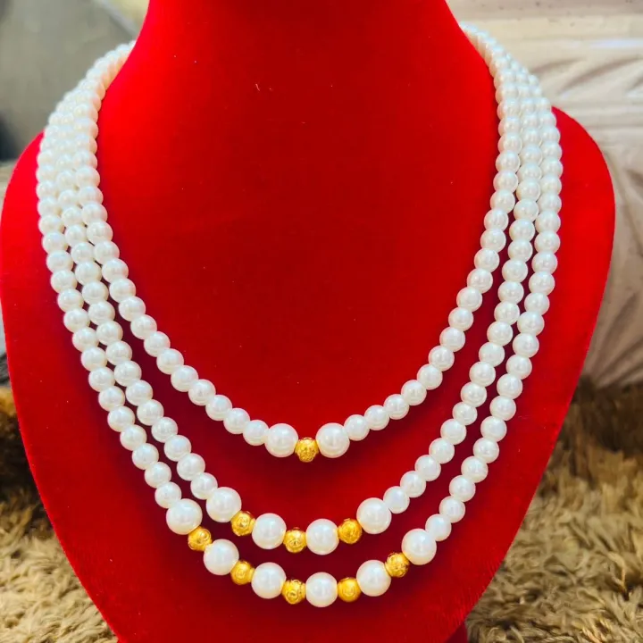 Three Layer Moti Mala Necklace With Gold Beads
