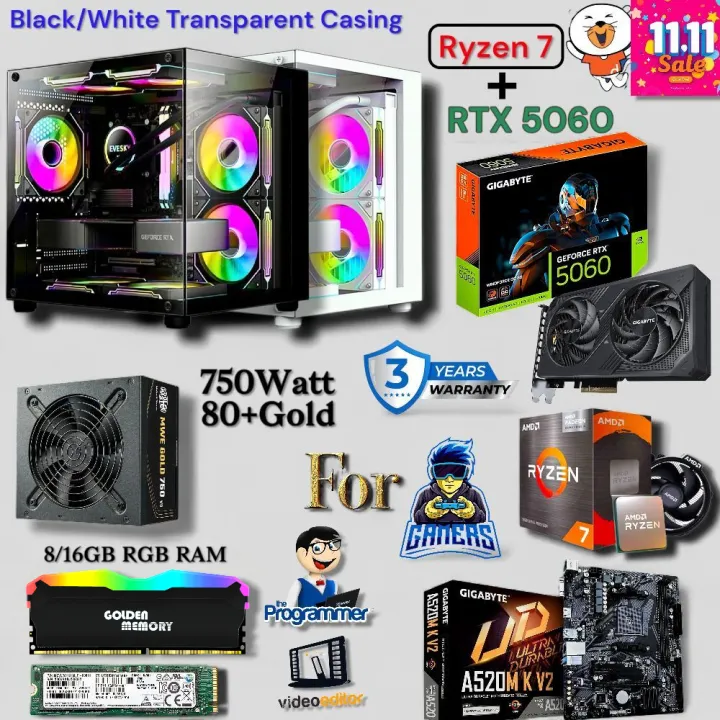 Transparent White Gaming PC Full Setup Pairs Ryzen 7 5700X Embedded RTX 5060 Graphics /8/16GB RGB 3200Mhz RAM, 750Watt 80+Gold PSU Performance Gaming Editing Desktop