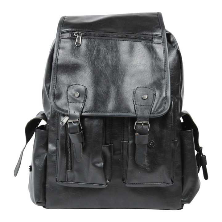 Unisex Plain Front Pocket Design Pu Leather 4 Compartment Backpack (Black)