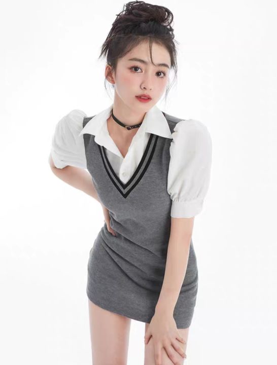 White Harajuku Short Sleeve Shirt Sexy Tight Mini Dress Emo Preppy Style Y2k Two Piece Set Korean Fashion Alt Clothes