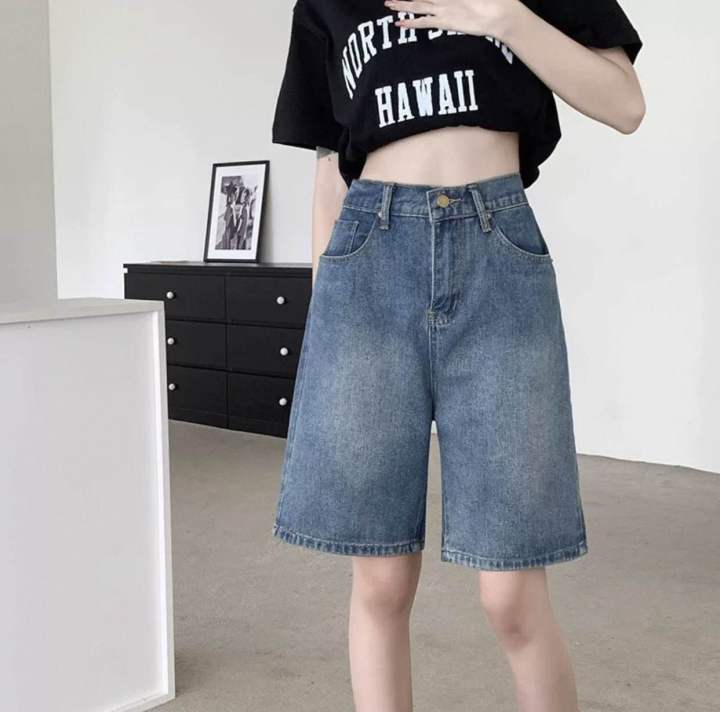Women's Summer Denim Shorts High Waist Wide Leg Crop Flared Blue Jeans