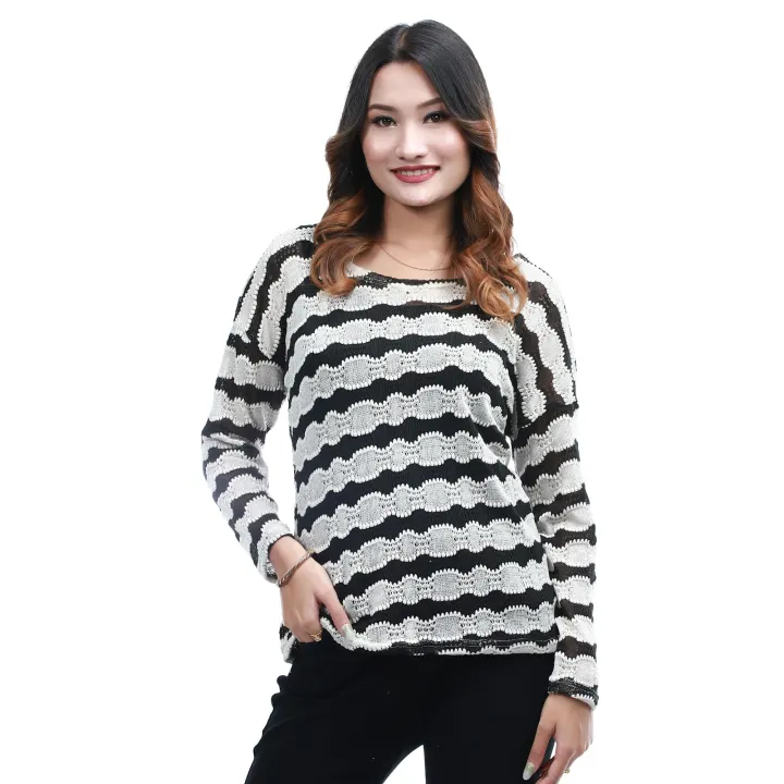 Woolen Round Neck Full Sleeves T-shirt For Women | Woolen Stripe Design Casual Tshirt For Women | Women's Fashion