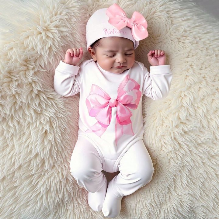 Ylsteed%202%20Pcs%20Set%20Big%20Bowknot%20Printed%20Newborn%20Girl%20Photography%20Romper%20Baby%20Long%20Sleeve%20Jumpsuit%20with%20Matching%20Hat%20Infant%20Props%20-%20Image%201