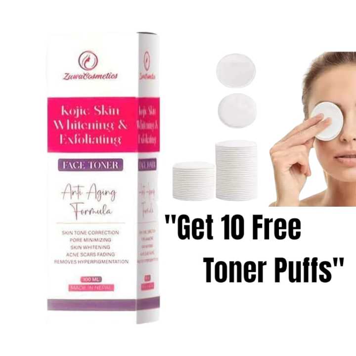 Zuwa Cosmetics Kojic Whitening & Exfoliating Facial Toner - Anti-Aging (100ml) + Free 10 Toner Puffs